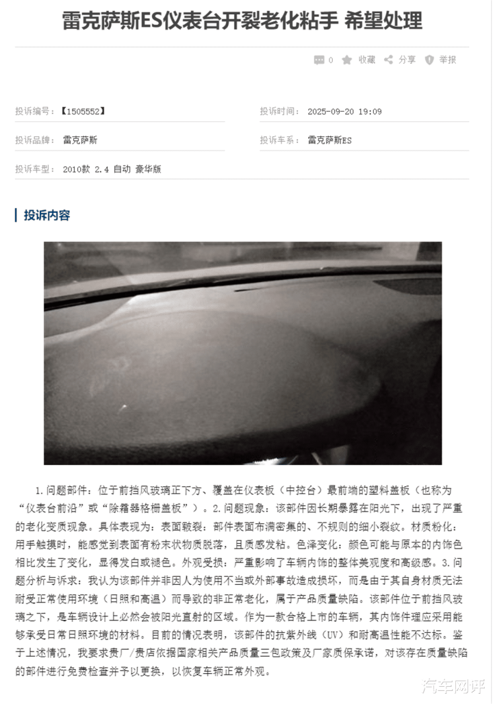 其中一位雷克萨斯ES 2010款 2.4 自动 豪华版的车主响应的情况,恰是老款ES车型通病的典型缩影,也精确规复了这类问题的中枢故障与维权逆境。车主明确暗示,车辆姿色台前沿(前挡风下方除霜器格栅盖板部位)因历久日常日晒,出现不行逆的批量性老化变质,莫得任何东谈主为使用不妥、外部刮擦或事故毁伤,矜重于居品材质自己残障;具体故障为部件名义布满密集怪异正的微弱皲裂纹路,用手触摸会有粉末状碎片阑珊,同期上层材质至极发粘黏手,透澈废弃了内饰原有的豪华质感,高温天气下老化部位还会出现领略反光,径直保密驾驶视野,埋下行车安全隐患。车主屡次酌量当地4S店疏通处理,门店均以车辆超出原厂质保周期为由,终止免费更换维修,需私费更换酌量部件,而酌量的更换老本自己偏高,因此激发车主的不悦。