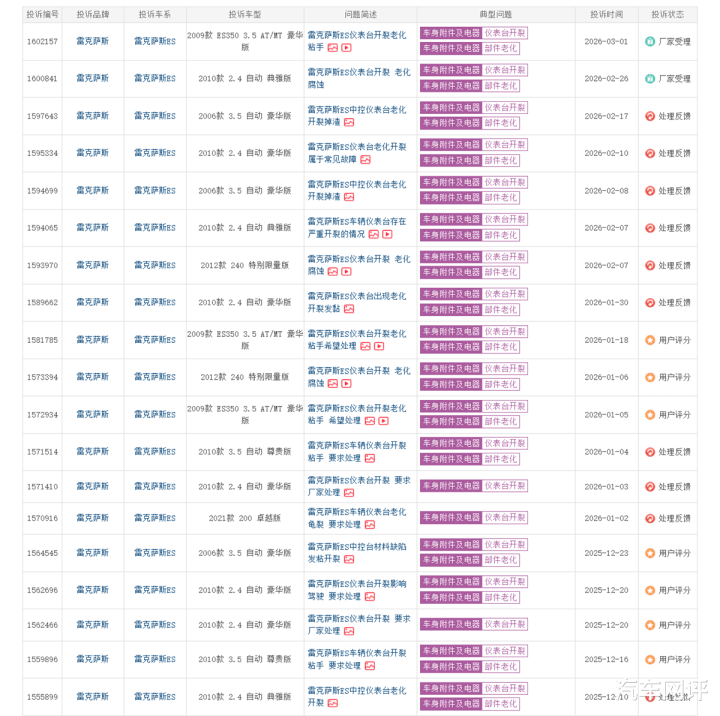 据某汽车投诉类网站近两年的数据炫耀,雷克萨斯ES的车身附件及电器类投诉长年居高不下,其中超九成投诉直指姿色台老化、开裂、发粘问题,问题聚拢爆发在2006-2018款车型,仅2012-2017款主力车型的有用投诉就特出1200例,ES200、ES250、ES300h全成就版块无一避免,以致部分老款RX、GS车型也出现同款故障,足以印证这是批次性居品通病,绝非车主使用养护不妥导致的个案。