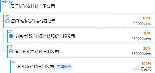 天眼查APP泄漏,新能安成立于2021年7月,注册老本为50亿元,控股鼓舞厦门新能和科技有限公司捏股85%。宁德时期捏有厦门新能和科技有限公司70%的股份,ATL通过全资子公司捏有剩余30%的股份。