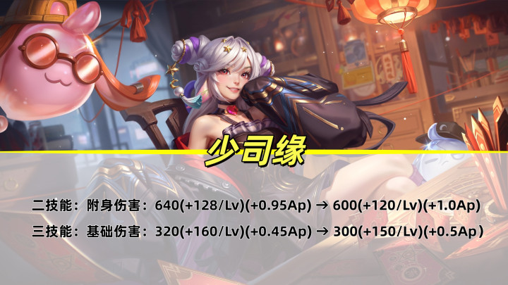 少司缘再次迎来收缩休养!二手段附身的基础伤害缩短40~80点,ap加成进步5%,大招基础伤害缩短20~40点,ap加成进步5%。