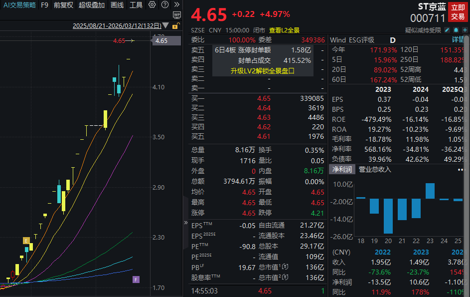 3月12日,此前时常领导股票往复风险的ST京蓝(000711)股价再度一字涨停,拿下“25天19板”。Wind数据显现,自2026年1月26日于今,该股股价累计高涨近170%。