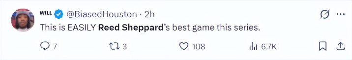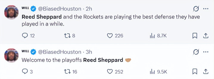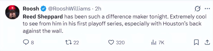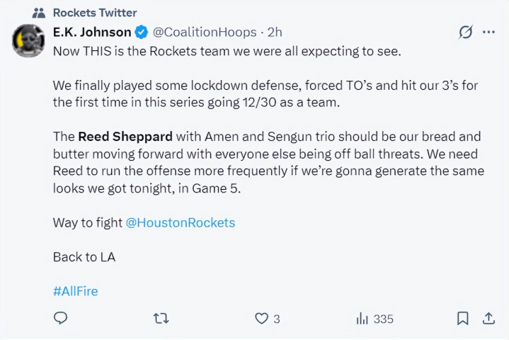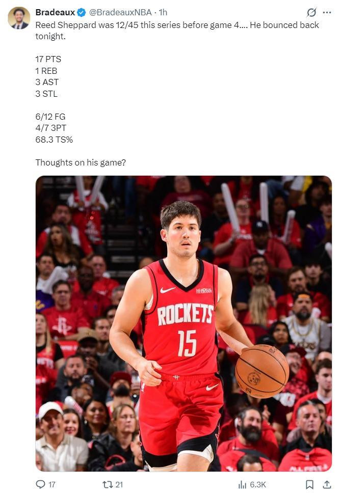 休媒Roosh:谢泼德这场比赛的进展号称出色,看到他季后赛能初次阐扬出色太棒了,尤其是在火箭队面临绝境的情况下。