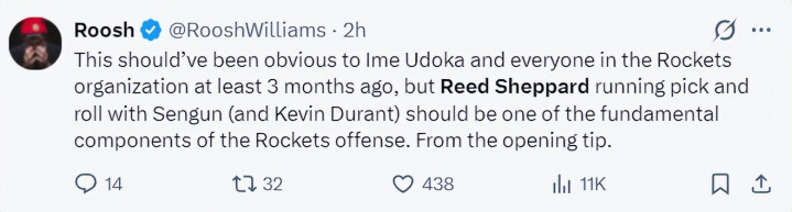 休媒Roosh:本体上在三个月之前,乌度卡与火箭队通盘东谈主就该显然,谢泼德、申京、杜兰特的协作才应该是火箭队要紧体系中不成或缺的中枢构成部分,从一运转就应该这么。