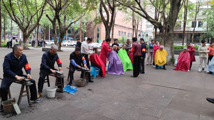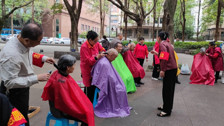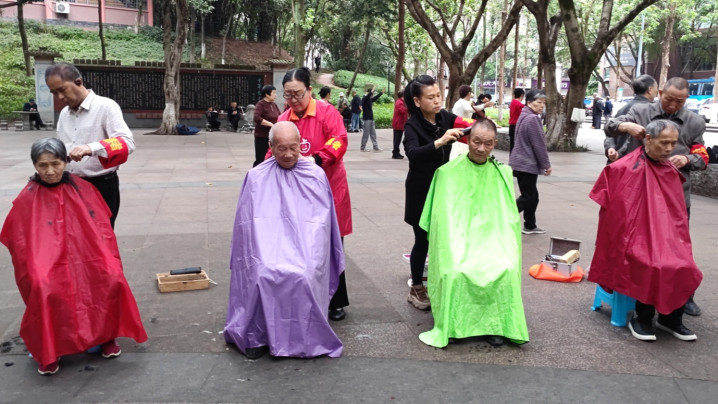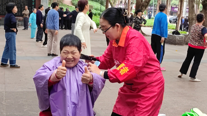 树荫下,剪发区的志愿者们手法娴熟,红、紫、绿各色围布衬得现场吵杂又温馨。一位大妈理完发后,对着志愿者竖起双拇指,脸上笑开了花,连声谈谢的相貌成了现场最动东谈主的画面。志愿者们一边为住户修剪头发,一边还和环球唠着家常、宣讲便民学问,剪刀的“咔嚓”声与欢声笑语交汇在一齐。