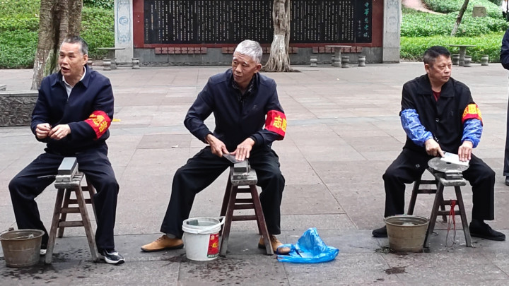 另一侧的磨刀区相同劳作,志愿者们坐在小马扎上,天博体育手握磨刀石反复打磨刀具,水花伴着“沙沙”的摩擦声落下,一把把钝刀在他们手中再行变得粗暴。左近就业限度时,一位住户仓猝拿着刀具赶来,面露焦灼地但愿能维护打磨,志愿者们莫得涓滴绝交,耐性性在路边为住户仔细磨好刀具,直到对方陶然离去才打理器用。