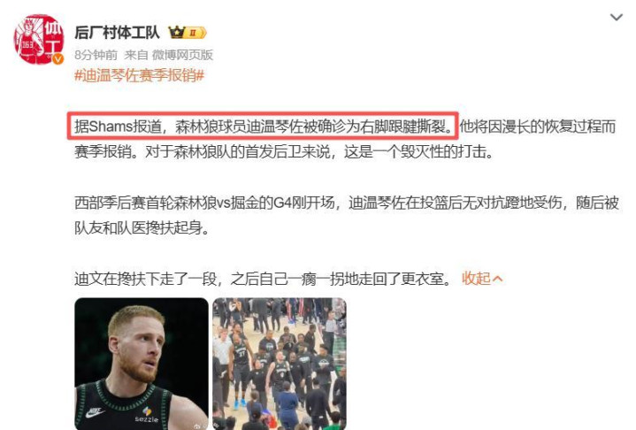 据好意思记Rob Murrows报谈,音问东谈主士露馅,迪文岑佐遭受右脚跟腱扯破!不外不久之后,这位NBA记者就删除了动态,可能还在恭候官方的音问!